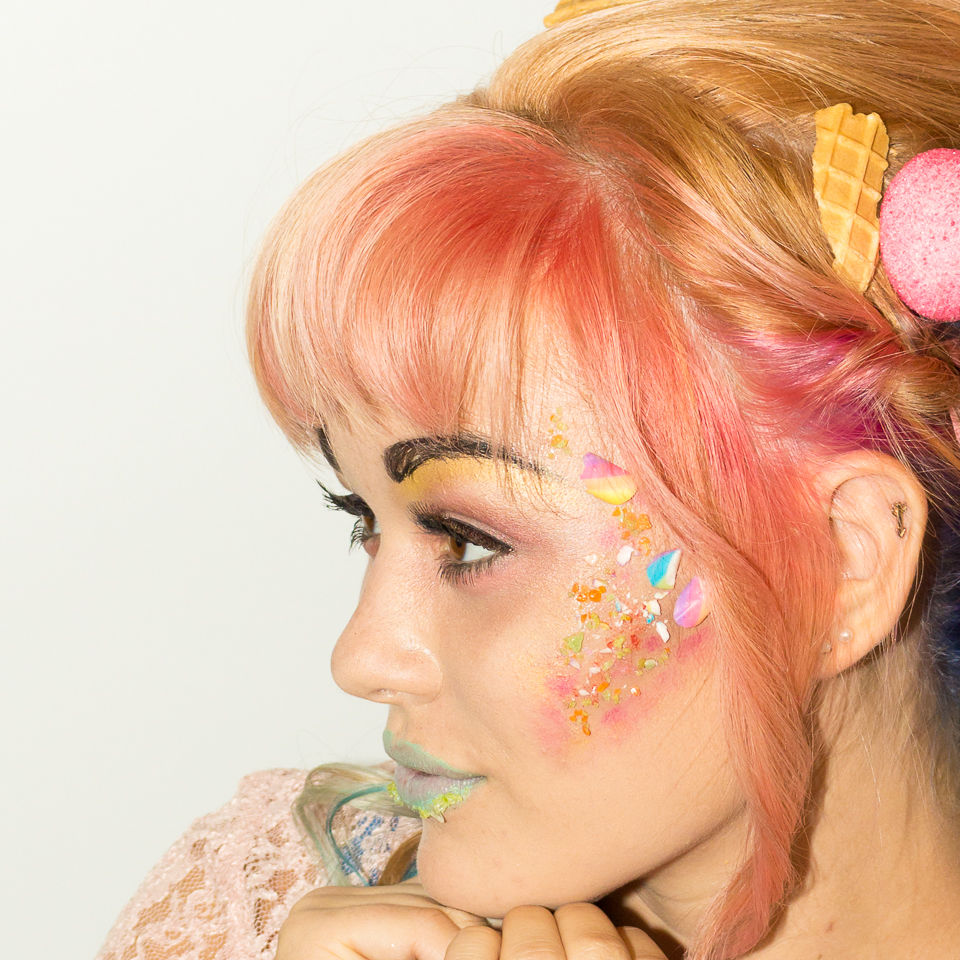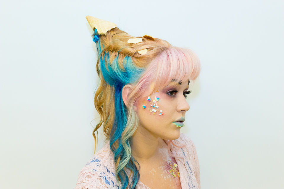 My entry for Avalon's Hair Show this past Friday. My model Jessi was made into a melting ice cream cone, candy princess. I wanted to avoid the obvious, so I didn't use fake pastel hair extentions, I actually colored her previously brown hair to a rainbow assortment and bleach washed the center section. I curled her hair up and around a stack of birthday party hats to create the cone portion. I contoured her face with candy peices and aimed to keep things simple yet impressionable. I'm very pleased with the results, seeing as everything was done on the spot and barely planned previous to show time. I'm curious to see what I can accomplish if I actually plan and prep for 4 weeks like we're supposed to.